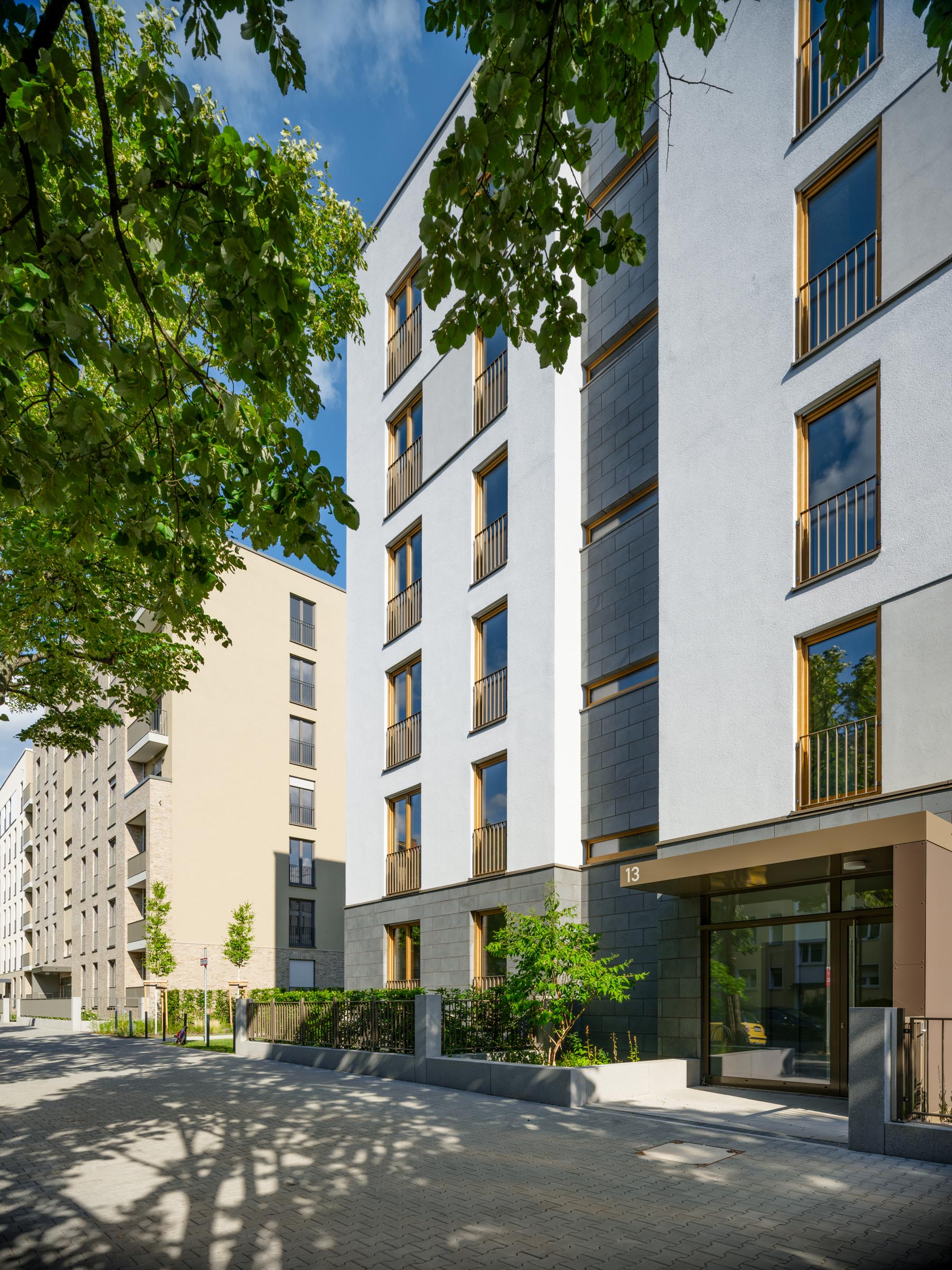 Die Baukörper entlang der Rödelheimer Landstraße und der Goldina-Hirschberg-Straße wurden teilweise verklinkert und bewusst mit unterschiedlichen Fassaden und Höhen ausgebildet, um so Monotonie zu vermeiden und eine individuelle Adressbildung („Mein“ Haus) zu unterstützen.