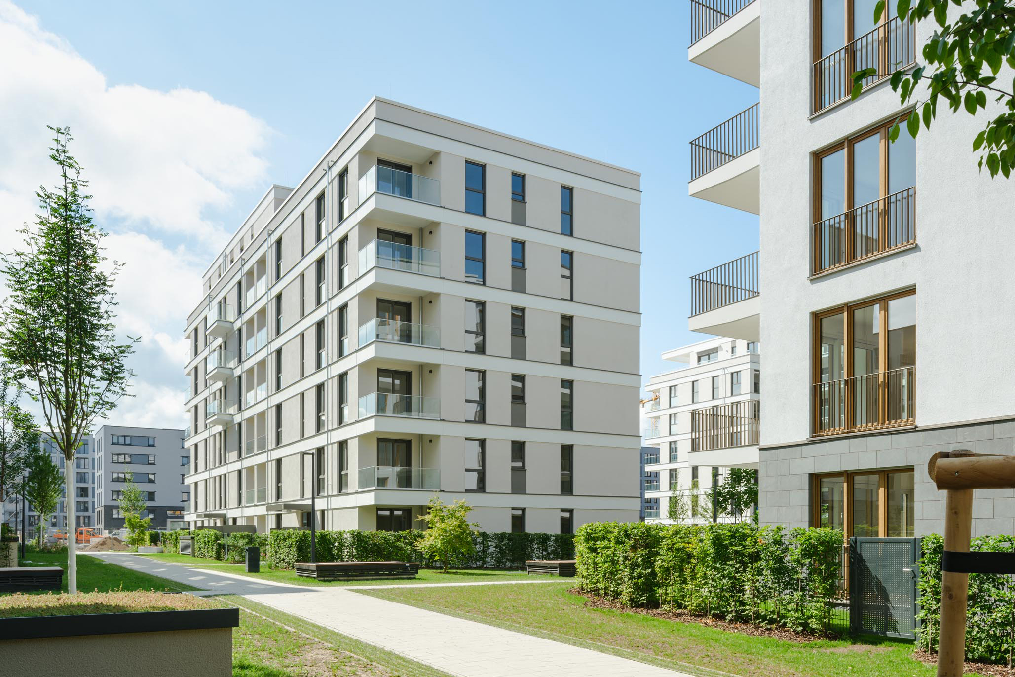 Die Plaza im Innern des Baufelds C2 fungiert als weiträumiges, kommunikatives Zentrum für das gesamte Quartier mit Spiel- und Aufenthaltsangeboten. Durch die geschickte Anordnung der Baukörper haben alle 132 Eigentumswohnungen einen Blick zum Park, jede verfügt über einen eigenen Balkon, eine Terrasse, Loggia oder Dachterrasse. Im Baufeld C3 entstanden 132 Mietwohnungen. Auch hier gibt es großzügige Freiräume im Inneren des Baufelds.